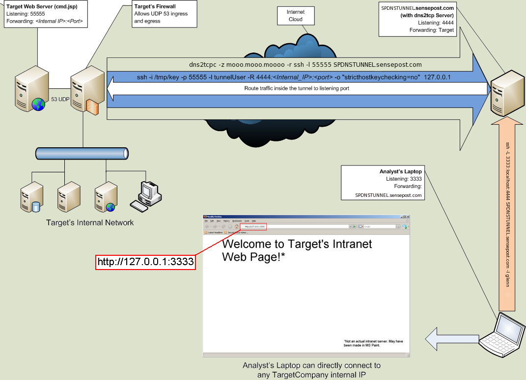 3) Create an SSH tunnel from target to SPDNSTUNNEL, forwarding traffic from SPDNSTUNNEL through target to internal network