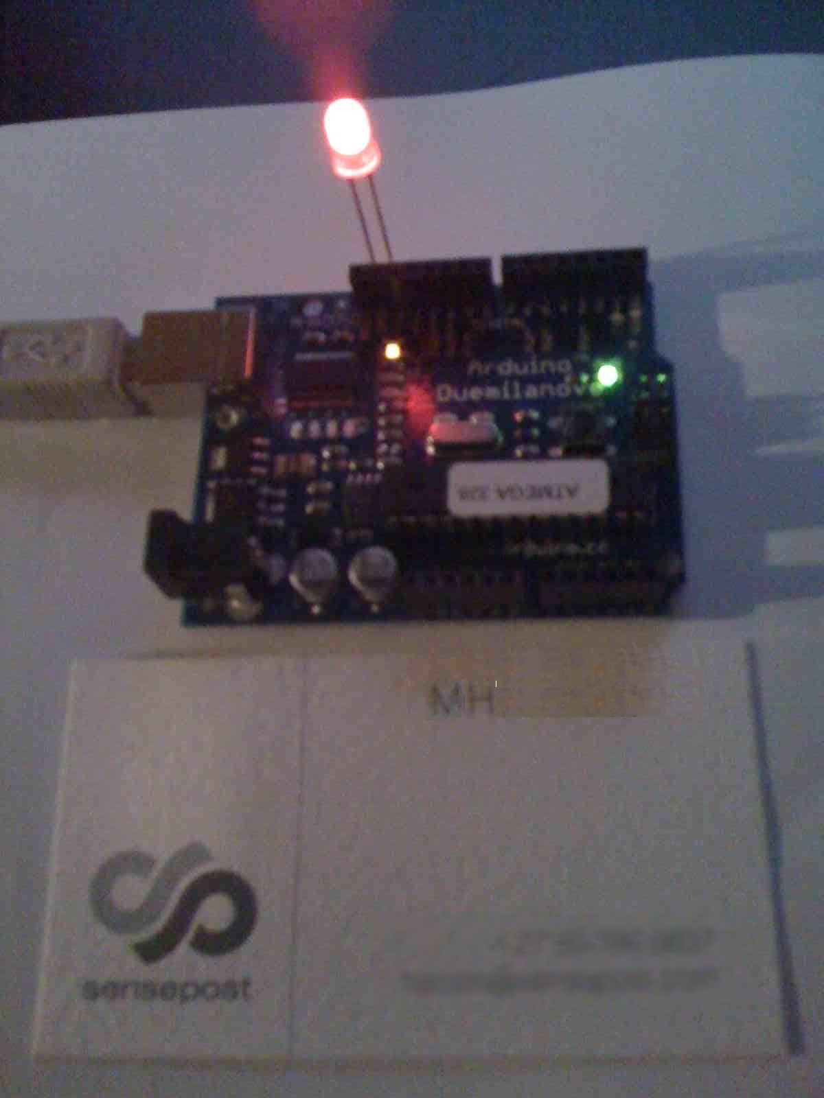 (i have placed the board next to a standard sized business card as a size reference – its much smaller than i expected (in my mind i imagined a NIC2000 type green PCB, not the prettyness that is the Duemilanove (Made in Italy, should have known!)))