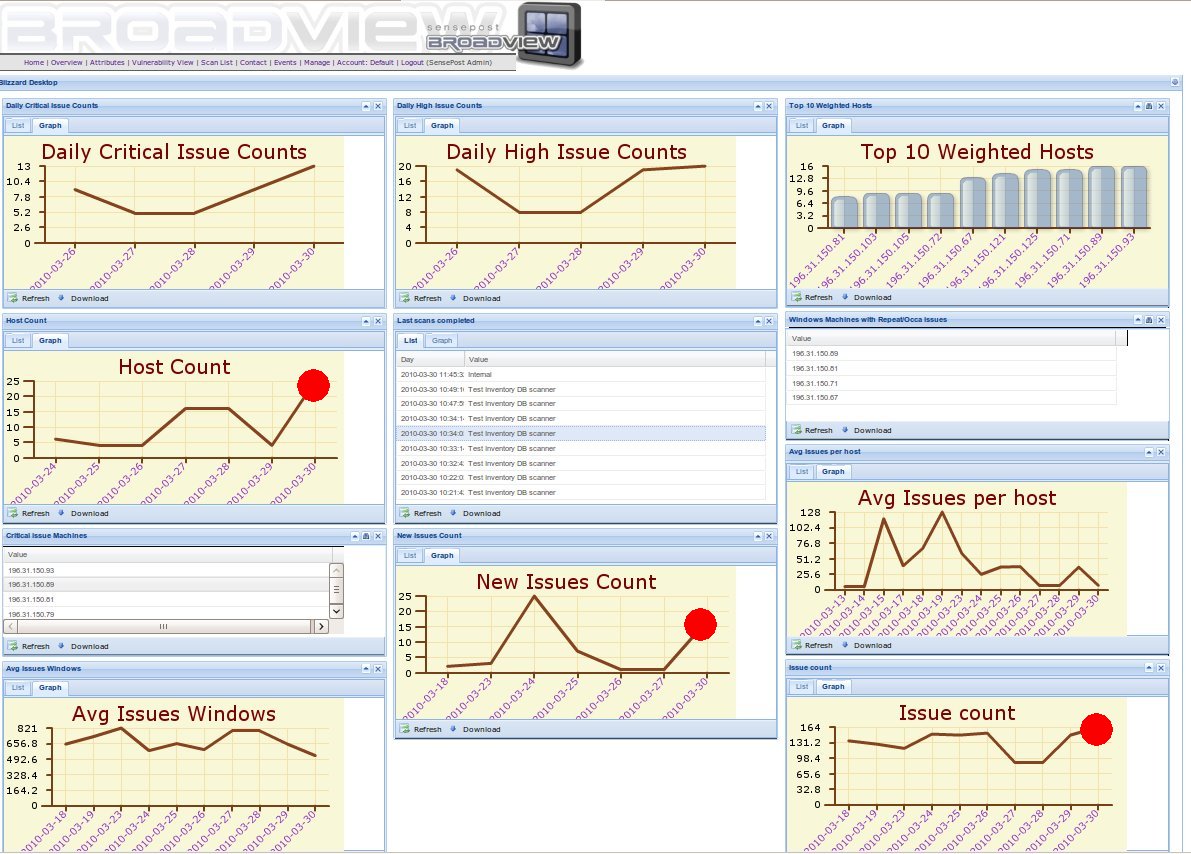 I mean, just look at this interface. The Blizzards page will allow BV users to get up to date stats about their environment but also allow them to quickly grasp the actual state of affairs on their network. Blizzards are visual sql queries that display averaged or calculated results of vulnerability scans as well as collected attributes. In the example below, one can quickly appreciate the impact of adding a batch of new machines to a scan, and the resulting impact on the New Issue count blizzard.