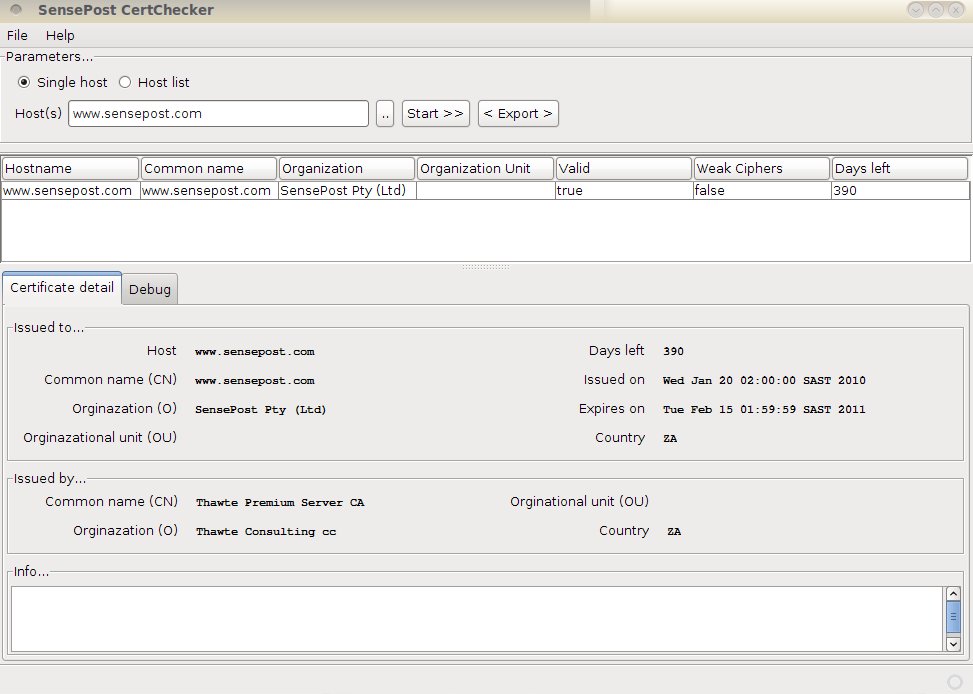 To enable our own guys and other security minded folk, we build a Java based SSL certificate miner that will show you the “Issue By” and “Issued To” information plus whether the cert is strong and have or will expire soon.