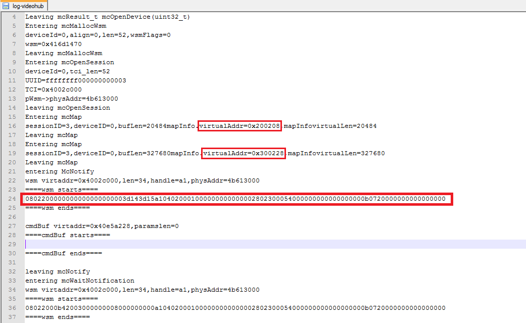 The videohub application dose not directly communicate with PlayReady trustlet. Instead, the Android DRM manager loads several DRM plugins including libdxdrmframeworkplugin.so which is dependent on libDxDrmServer.so library that makes Mobicore API calls. Both of these libraries are closed source and I had to perform dynamic analysis to monitor communication between libDxDrmServer.so and PlayReady trustlet. For this purpose, I could install API hooks in android DRM manager process (drmserver) and record the parameter values passed to Mobicore user library (/system/lib/libMcClient.so) by setting LD_PRELOAD environment variable in the init.rc script and flash my phone with the new ROM. I found this approach unnecessary, as the source code for Mobicore user library was available and I could add simple instrumentation code to it which saves API calls and related world shared memory buffers to a log file. In order to compile such modified Mobicore library, you would need to the place it under the Android source code tree on a 64 bit machine (Android 4.1.1 requires 64 bit machine to compile) with 30 GB disk space. To save you from this trouble, you can download a copy of my Mobicore user library from here. You need to create the empty log file at /data/local/tmp/log and replace this instrumented library with the original file (DO NOT FORGET TO BACKUP THE ORIGINAL FILE). If you reboot the phone, the Mobicore session between Android’s DRM server and PlayReady trustlet will be logged into /data/local/tmp/log. A sample of such session log is shown below: