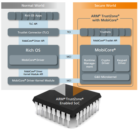 The Samsung Galaxy S III was the first mobile phone that utilized ARM TrustZone feature to host and run a secure micro-kernel on the application processor. This kernel named Mobicore is isolated from the handset’s Android operating system in the CPU design level. Mobicore is a micro-kernel developed by Giesecke & Devrient GmbH (G&D) which uses TrustZone security extension of ARM processors to create a secure program execution and data storage environment which sits next to the rich operating system (Android, Windows , iOS) of the Mobile phone or tablet. The following figure published by G&D demonstrates Mobicore’s architecture :