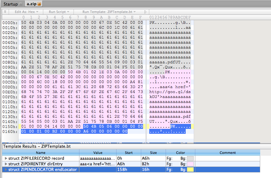 A few days ago, during one of those nights with the baby crying at 2:00 am and the only thing you can do is to read emails, I realised that Gmail shows the content of compressed files when reading them in Google Docs. As often is the case at SensePost, the “think evil ™” came to me and I started to ponder the possibilities of injecting HTML inside the file listing. The idea is actually rather simple. Looking at the file format of a .zip file we see the following: