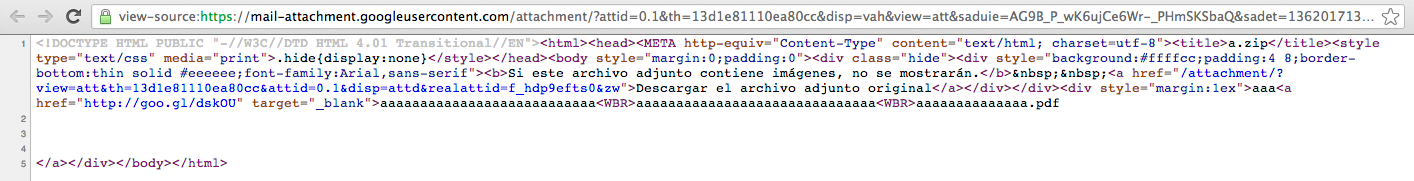 As you can see, Google shows the file name inside the compressed file but the tag is displayed with HTML entities. If we then try to see the contents of the file, Google responds by telling us it’s not possible to read the content of the file (it’s empty) and shows you the file “without formatting” after a few seconds: