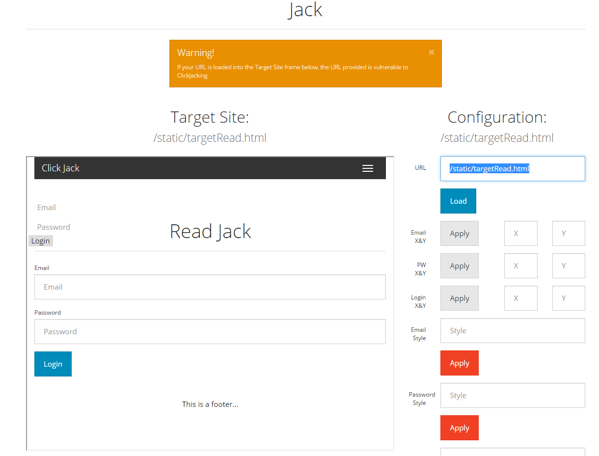 Jack comes with three additional pages; sandbox.html, targetLogin.html and targetRead.html. targetRead.html can be used to demonstrate Clickjacking that reads values from a page and sandbox.html is used to display the Clickjacking demonstration. Jack by default loads the “Read” html page with default CSS and Styles.