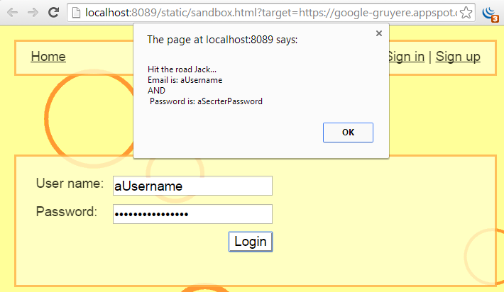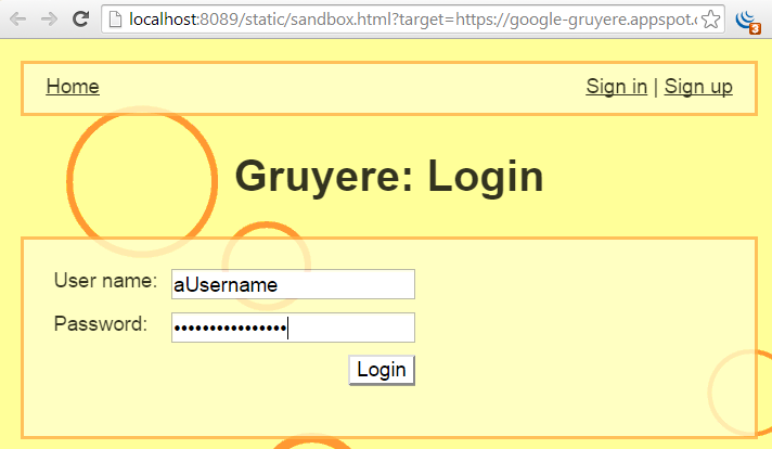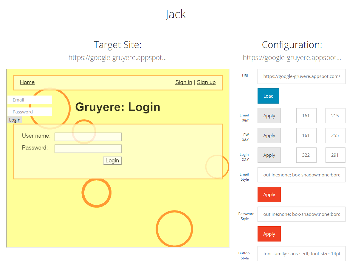 Jack allows you to configure a few parameters (X&Y positions, Style tags) that can be used to demonstrate Clickjacking. In this example, we will demostrate Clickjacking using the Google Gruyere as a target https://google-gruyere.appspot.com/211539457592/.