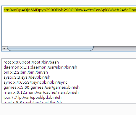Finally all we needed to do was base64 decode the result from the URL and we would have the contents of /etc/passwd.