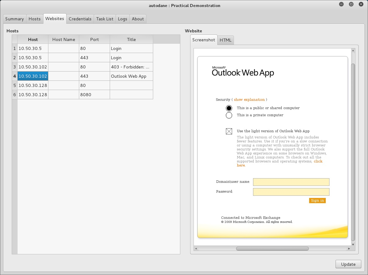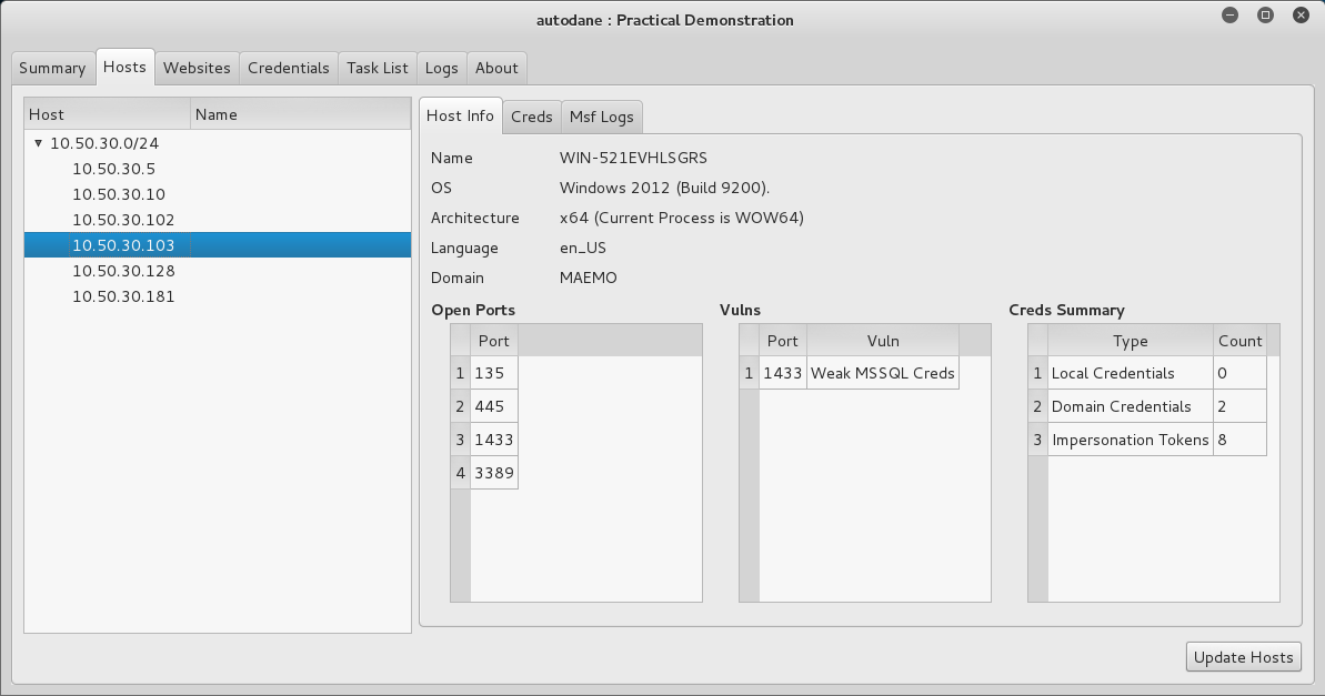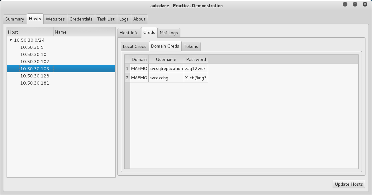 These exploit vulnerabilities found in the previous phase, and gather as much information as possible from the hosts, such as impersonation tokens, local user hashes, credentials stored by the Windows Local Secret Authority, and credentials stored in memory. The primary focus of this phase is to collect credentials, however, you can always feed autoDANE your own creds if you prefer.