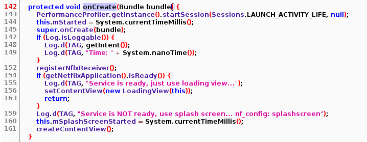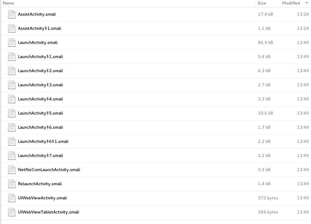 At this point we now have our two Smali files in the target directory and we now need to configure the target Activity(Netflix) to call our code. We will now modify “com.netflix.mediaclient.ui.launch.LaunchActivity” to call AssistActivity which in Java looks like: