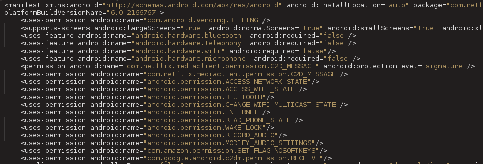 So what does this mean? Simple, without having to add permissions to get “full” device access, the legit Netflix app asks for internet and microphone permissions so we don’t have to do anything to gain access and record the devices microphone when a victim runs our Netflix app. But how would the Netflix application look if we were to add ALL the permissions we need to get all the functionality provided by meterpreter?