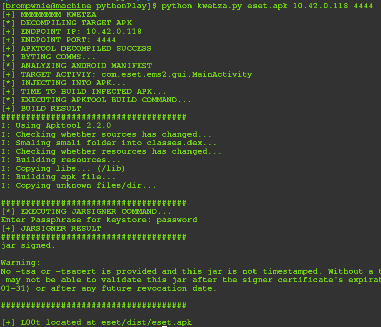 Kwetza relies on two important dependencies. Python’s BeautifulSoup and ApkTool. Both are simple to setup and the ApkTool defaults will suffice.