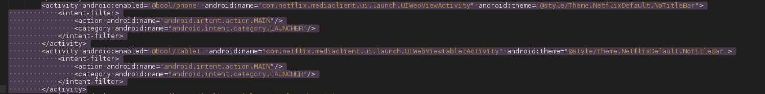 At this point we have a single file representing our payload. Next we need a target, lets chose the Android Netflix application. Grab a hold of the APK from either the PlayStore or somewhere else, if you dare. In terms of inspection, we want our payload to be executed the moment the user taps/clicks/rubs the Netflix icon. How do we achieve this? Easy, we look at the AndroidManifest.xml file which will tell us EXACTLY which Activity (i.e Java class) is executed when the application is started. To do this, search for the attribute “MAIN” and “LAUNCHER” in the manifest. This will disclose the activities and associated files used when the application is executed by the system.
