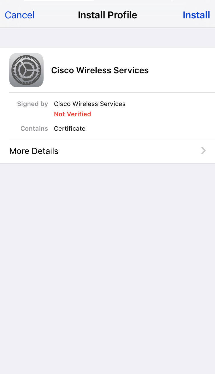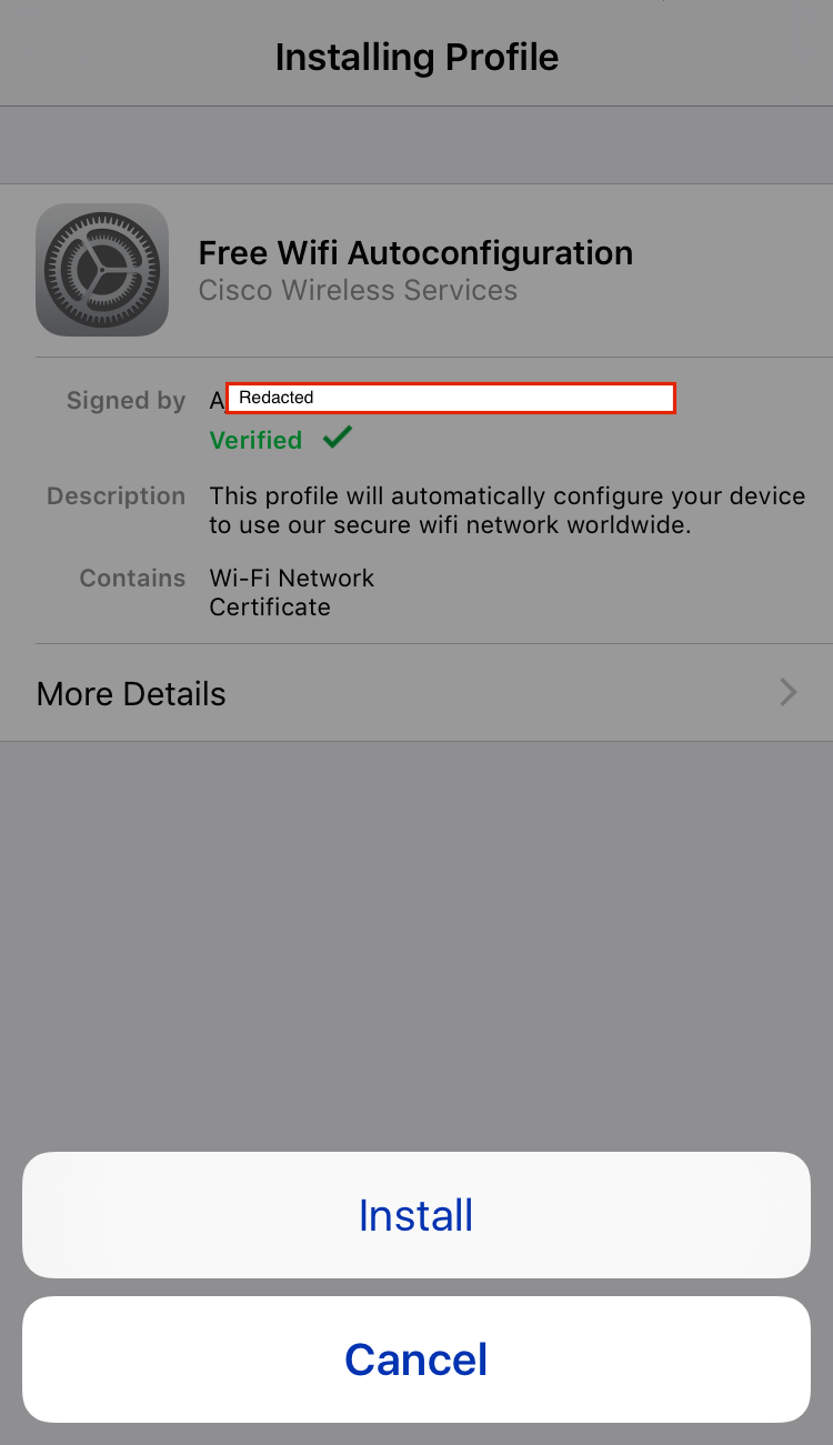 2 The same warning as before about how a certificate will be added to your trusted root store, but gone is the “This profile is unverified” warning. Again, to a non-technical user, this really doesn’t sound scary. To technical users they may even still be fooled since it doesn’t mention that it will be added as a trusted root CA.