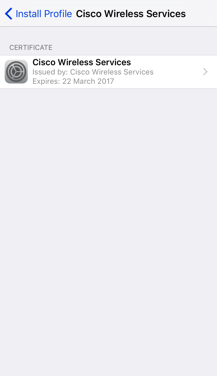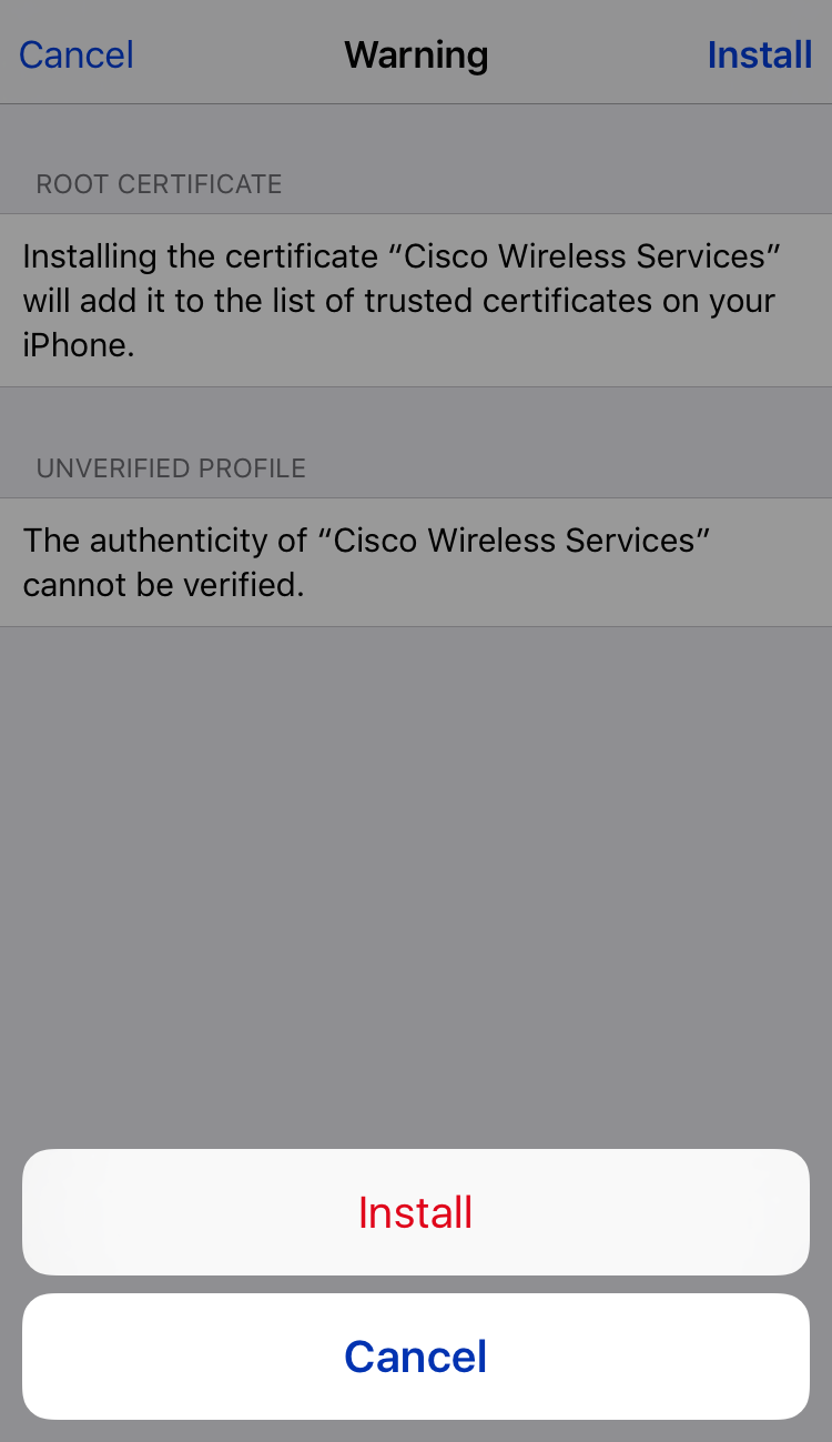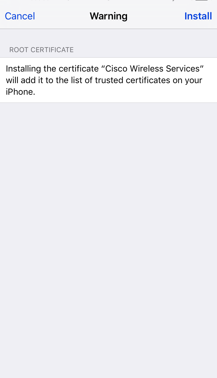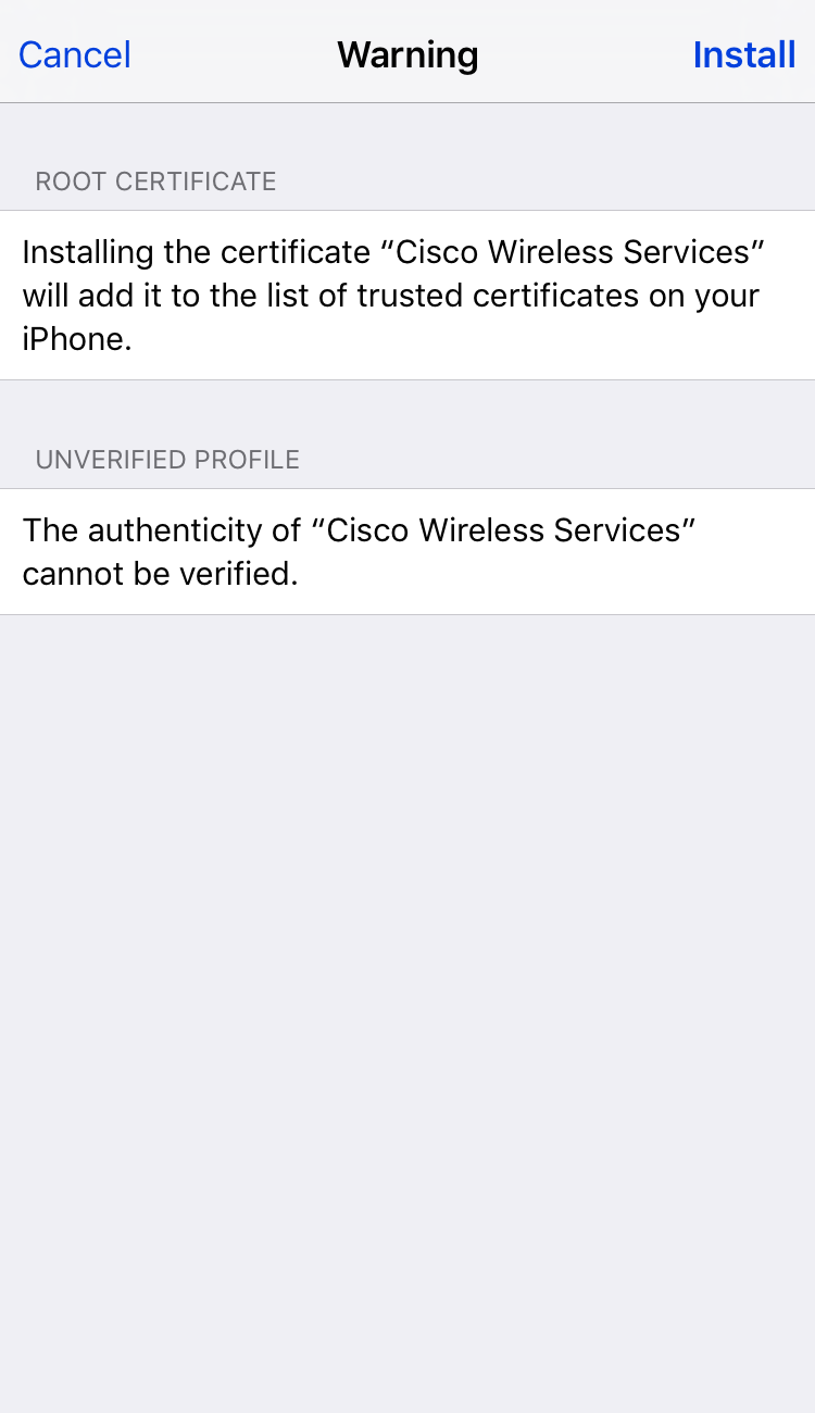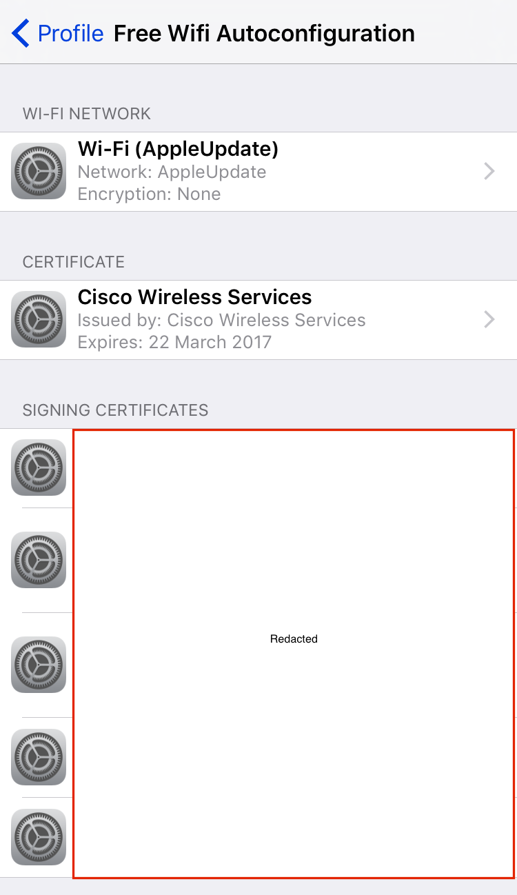 First, we put together a simple configuration profile using Apple Configurator 2 or older iPhone Configuration Utility. Both of these generate a simple plist file. In this configuration, I add the same self-signed certificate as a credential and export the configuration to a .mobileprofile, making sure to leave it unsigned and unencrypted. Next, I sign the file using a valid code signing certificate with openssl (as detailed here). Make sure you include the full certificate chain, as the device won’t download and follow the chain itself. Just to show the profile doing something else, I add a hidden network that devices will probe for (and get responded to by mana). Finally, we update our captive portal to serve the .mobileprofile file instead of the certificate. Again, you just serve it, no fancy headers or mime-types required. This is what a user sees.