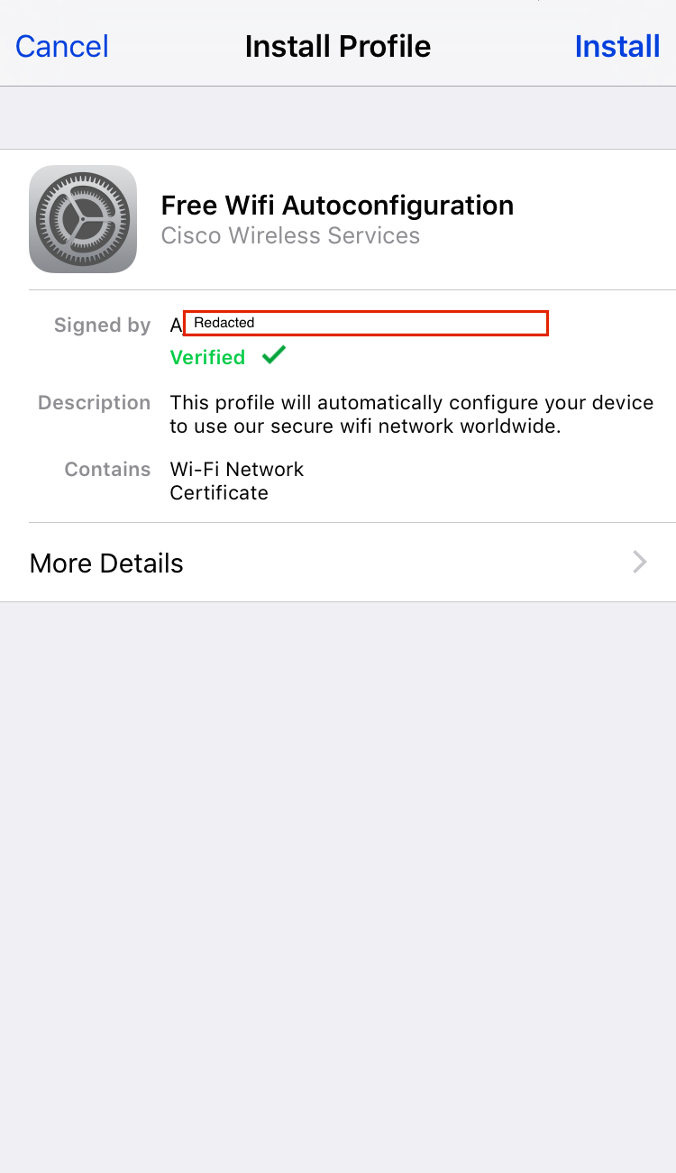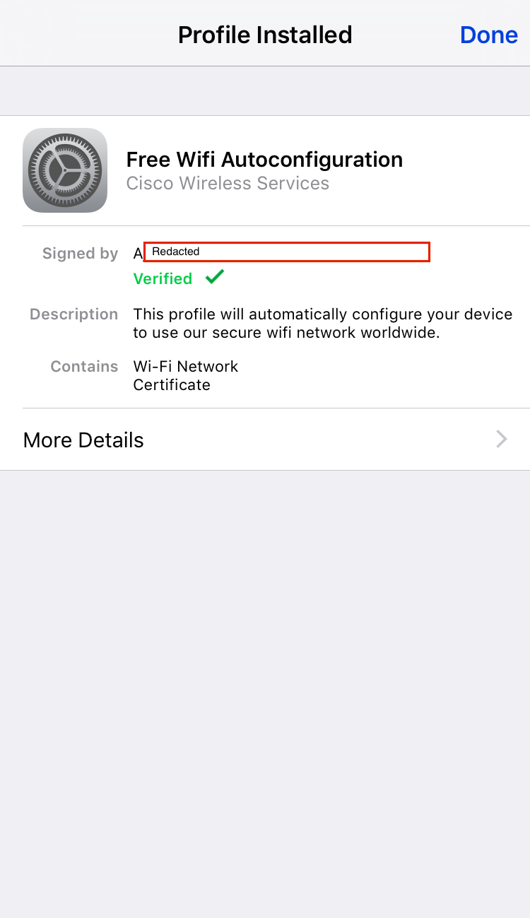1 What a user is prompted with on connection. Gone is the red “Not Verified” now replaced by a green “Verified” resplendent with a tick due to the profile having been signed , even though it contains a malicious, unverified, root CA. We also get to add some explanatory text to make the user feel more comfortable.
