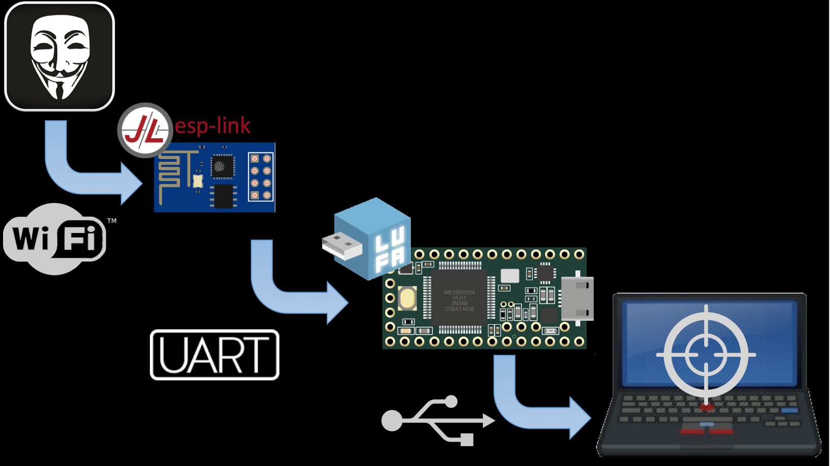 We took some fairly common attacks (fake keyboards in small USB devices that type nasty things) and extended them to provide us with a bi-directional binary channel over our own wifi network to give us remote access independent of the host’s network. This gives us several improvements over traditional “Rubber Ducky” style attacks: