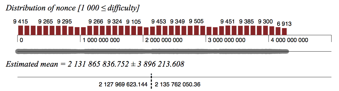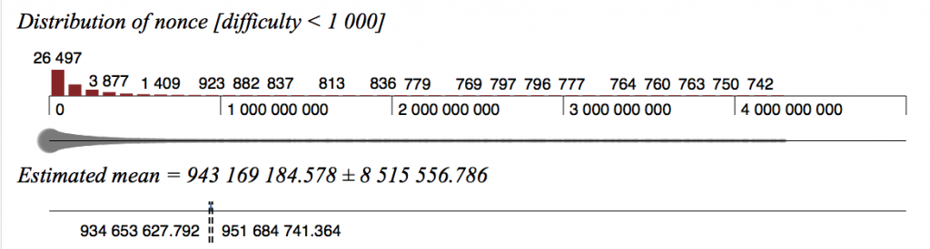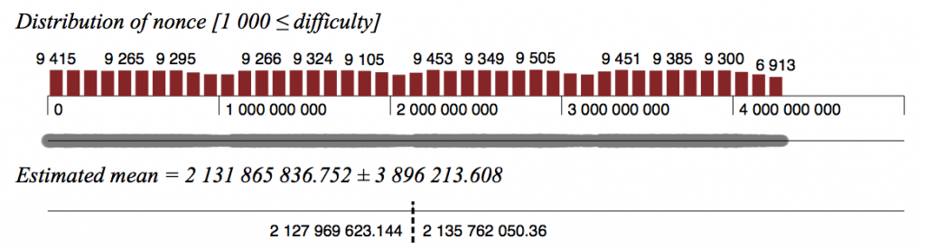 The nonces in this later set follow a much flatter distribution, and if they were randomly chosen, for a set this large, the expected mean number of bits set in the 32 bit nonces should be extremely close to 16. The actual mean number of bits set is 15.701, which a highly significant deviation from the expected value: