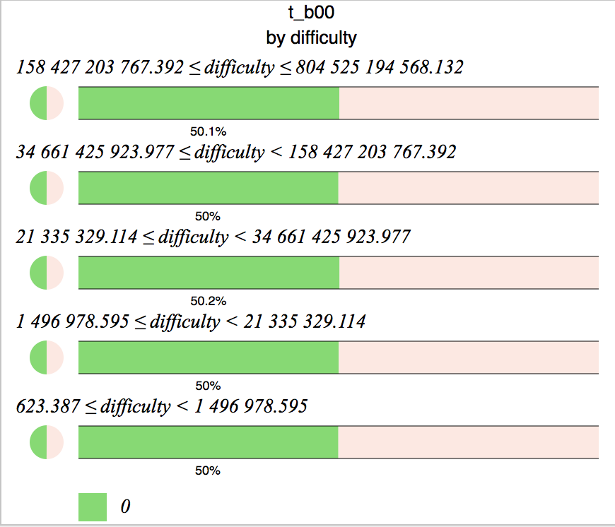 Studying the values of the individual bits making up the nonces is even more interesting. To appreciate the effect, here is what the value of the LSB of the time value looks like as the difficulty increases: