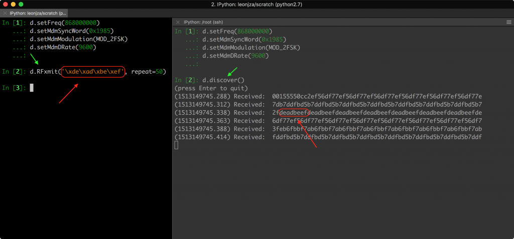 I tried quite a few things to be honest. Making sure I use the same frequency, modulation and baud rate on both ends of the transmission seemed obvious but just didn’t get me a way to reliably transfer data between the two Yardstick Ones. I would prepare hex encoded bytes to send with RFsend() on the one end, and try and receive them again using RFRecv() on the other end but just couldn’t reliably get transmissions to flow. In fact, all I got was noise. Using the discover() method, one could remove some of the noise filtering automatically applied by RFCat (lowball mode) to try and discover more signals, but this too failed me. Eventually I toggled the IdentSyncWord flag in the discover() method and realised that I never set a sync word to begin with. Well… one call to setMdmSyncWord() later and could finally reliably transfer frames between the two Yardstick Ones!