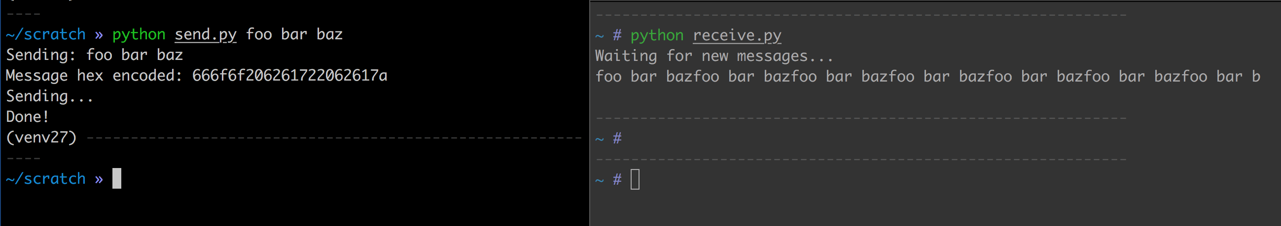 With the ability to transfer frames reliably, it was time to write some scripts to make this easier. A simple send.py and receive.py would suffice. All they need to do is setup the radios by configuring the frequency, sync word, baud rate and modulation in use. Then, simply encode and send / decode on receive.
