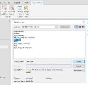 Fortunately for us, Outlook has a massive attack surface and provides several other interesting automation features. One of these is Outlook Forms. Forms provide a user/organisation with email customisation options on how it is presented or composed. This includes features such as autocompleting the bcc field or inserting template text.