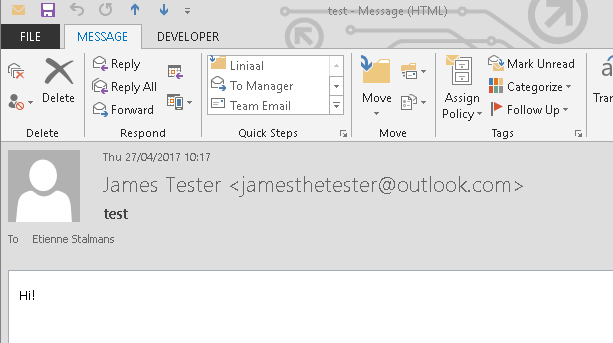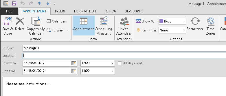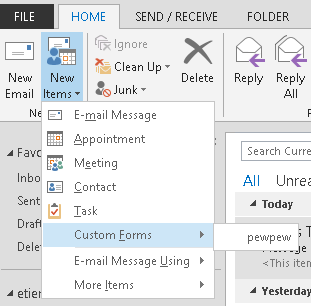 After the form is saved, you need to be able to activate/trigger it somehow. This can be done directly through the Outlook interface, but this is not very useful, as you will be shelling yourself. If you want to test if a form works as you would like it to, select the inbox and then in the ribbon select New Items -> Custom Forms -> Form_name.