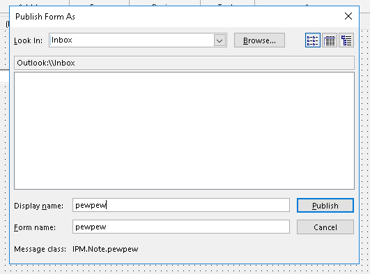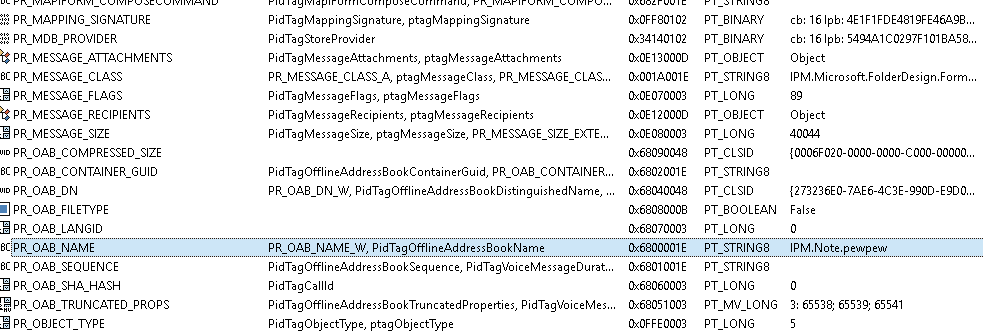 Weirdly enough, PropertyTags such as PidTagOfflineAddressBookName are used to describe the form, there aren’t any PidTag[form] PropertyTags. This particular tag controls the message class of the form – in this case IPM.Note.pewpew. The form document, along with the VBScript to execute is saved in an unique attachment, the data of this form is stored in the Outlook message format, basically the same format used when you save a message to disk.