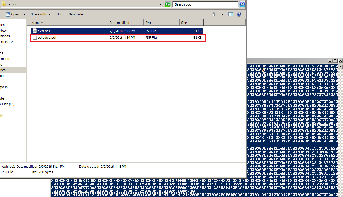 Next up, the PowerShell script would be run in order to exfiltrate the goods, in this case Schedule.pdf, from a host protected by Forcepoint.