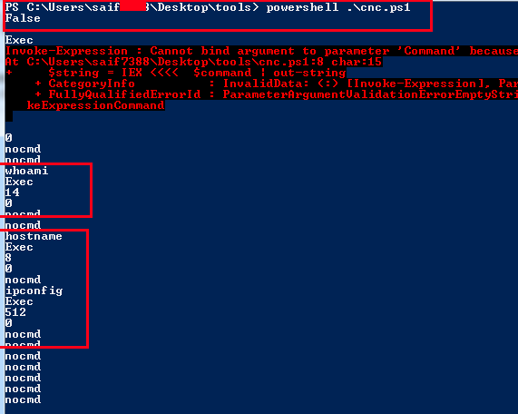 A PowerShell script was developed that beacons back to the web server, and the server responds with a redirect to an invalid domain. If the domain was ‘nocmd‘, then no action was taken, if it was anything else, such as ‘whoami‘ the domain, or command, would be updated by the server on command entry on the terminal, execute it and return the results back to the web server using the method discussed in the first section of the post.