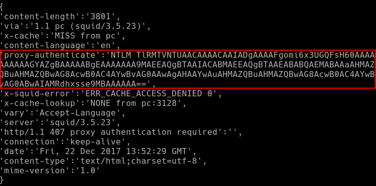 All the key and value pairs in the resulting dictionary were mismatched, with some of the header values acting as keys, and vice versa. Specifically, the Proxy-Authenticate value which contains the NTLMSSP challenge was incorrectly assigned as a key.