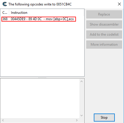 At this point all the possible instances could be either the original, or a copy of the original ammo count. We can watch these memory locations to determine which instructions write to them in an attempt to identify the code that is responsible for decreasing the ammo. To do this in CheatEngine, you can simply click right a watched memory location, and select “Find out what writes to this address”.