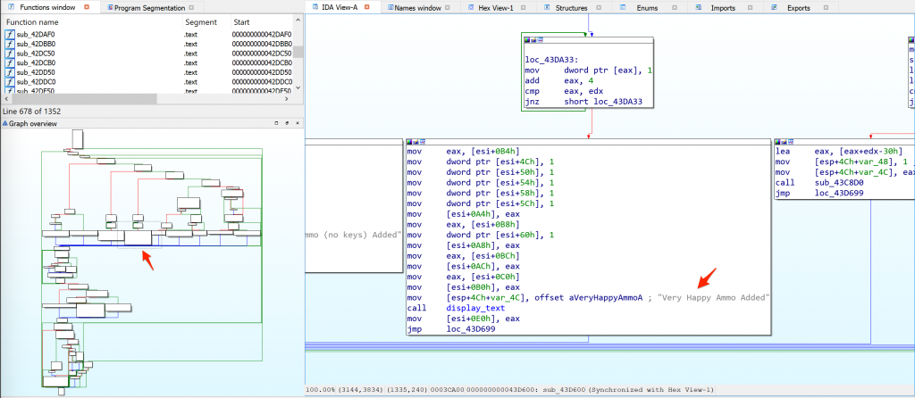 Given that we know which instructions were writing to memory regions that contained the ammo value for our handgun, we used IDA to analyse the function around the instruction to find the entry point for it. This way we would know which memory address to use with the Interceptor.