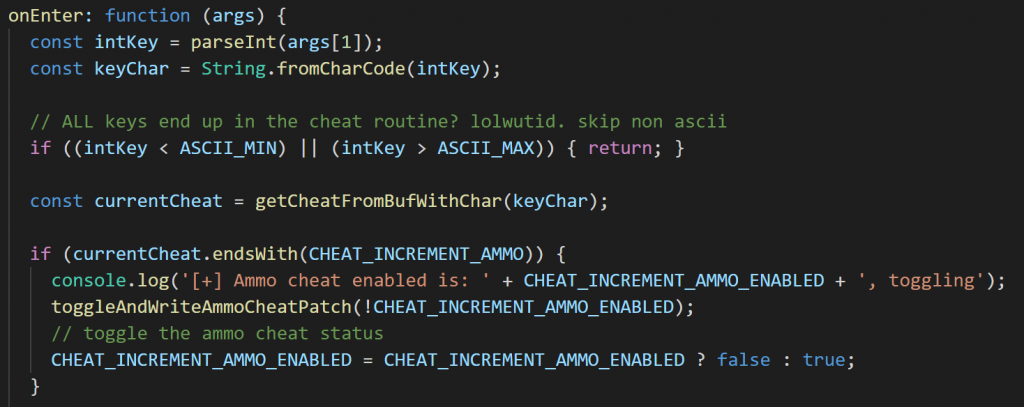 Next, we attached to cheat_compare and fired this new getCheatFromBufWithChar() to get the buffer of characters that were entered thus far. If a buffer ended with one of our strings, we fired the relevant patch to activate the cheat! To optimise the routine a little, we exited early if the entered keycode was not in the ASCII printable range.