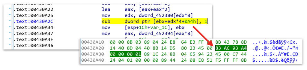 The third match we had saw writes only when the handgun was fired. The instruction was a subtraction by one and therefore likely the instruction to decrease the ammo count we are interested in. CheatEngine allows you to disassemble code around the identified instruction. Using this, we had the location of the instruction responsible for decreasing the ammo count when the handgun was shot at 0x0430A2c.