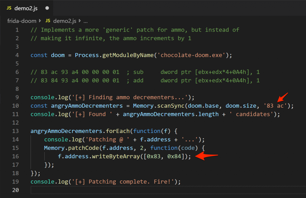 We didn’t want to hardcode all of the instructions we found and looked for other options. When searching in IDA for the opcodes 0x83 0xac (part of the ammo SUB opcodes for sub dword ptr [ebx+edx*4+0A4h], 1), we noticed that the only matches were those that formed part of functions that decremented ammo. Frida has a memory scanner that we could use to match the locations of these functions that we were interested in dynamically (as 0x83 0xac), available as Memory.scanSync(). We then used the same Memory.patchCode() function to simply override the opcodes to ADD instead of SUB as a simple two-byte patch :)