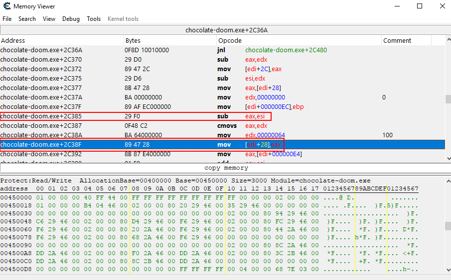What is important to note is that instruction was a subtraction between two registers, i.e. sub eax, esi. This is a fairly common instruction, and meant that we can’t just scan for all instances of it in memory and replace it with an add instruction like we did with the ammo increment patch. Instead, we manually went to the location of each of the sub instructions, and changed it to an add instruction. When viewed as opcodes, sub eax, esi is 0x29 0xF0, while add eax, esi is 0x01 0xF0. So, a patch was simply a case of swapping out the 0x29 for a 0x01. The sub instructions for the three different functions were at 0x3DEEC, 0x2C385, and 0x2c39.