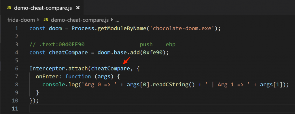 We decided to have a look at the invocation of this cheat comparison function (henceforth called cheat_compare) at runtime, dumping the arguments it receives. Just like we have previously used the Frida Interceptor to attach to a function, we simply calculate the offset for cheat_compare and log the arguments it receives. This will also give us an opportunity to try and discover how to trigger this function in game.