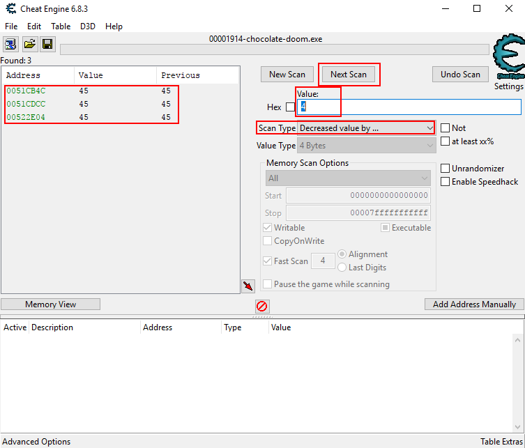 To pinpoint exactly the right location, we can can change the value a bit, and then rescan using CheatEngine for any instances of the previously found value that was altered by the same amount. We could do this by shooting the handgun a few times and taking note of by how much the ammo count was changed. We can then use the “Next Scan” function and the “Decreased value by” scan type option to search in CheatEngine for a value that has also changed by the same amount. This decreased the amount of possible locations for the ammo count to only three.