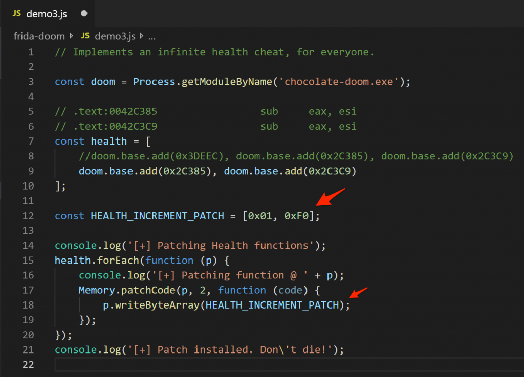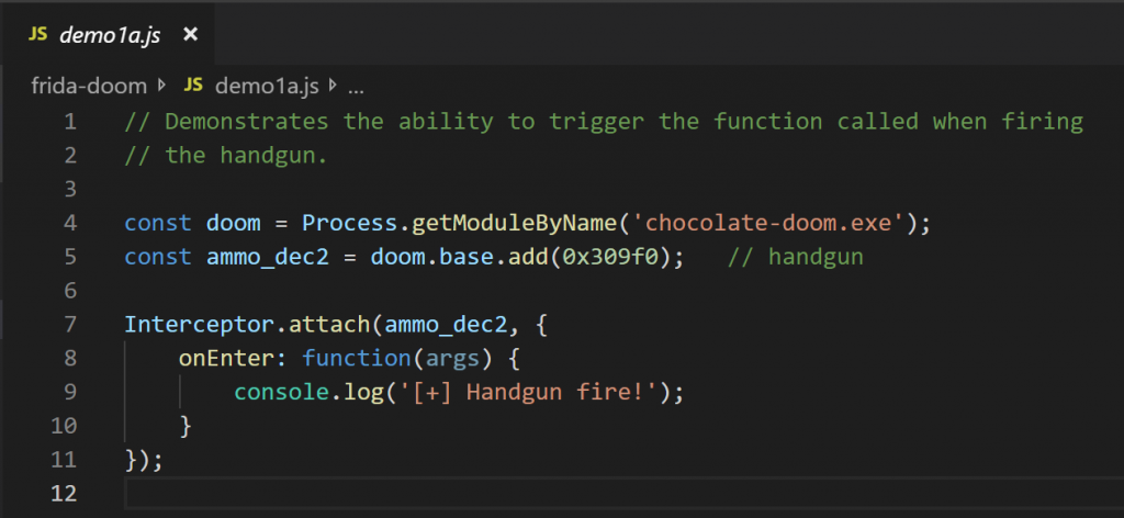 As you can see in the screenshot above, the function starts at 0x4309f0. With a base of 0x400000 that means that the function’s offset is just 0x309f0 from that (this will be important later). With a known offset, our first Frida script started. This script would simply find the chocolate-doom module’s base address, calculate the offset to the function we are interested in and attach the Interceptor. The Interceptor onEnter callback would then simply log that the function triggered.