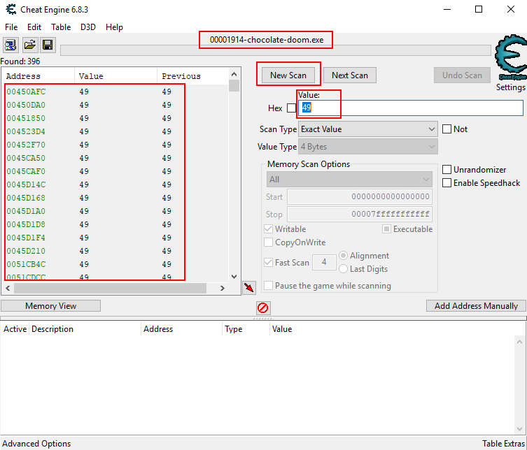 First up was finding out what code was responsible for the ammo count. CheatEngine is a memory scanner and debugger that is particularly suited for this task. You can attach to a running process with CheatEngine, and scan the process’ memory to find all instances of a particular value. If our ammo count is currently 49, we can search for all instances of the value 49 in memory. There may however be quite a number of instances of this value within the process’ memory – a scan will often return several. Additionally, not all instances will be related to the ammo count.
