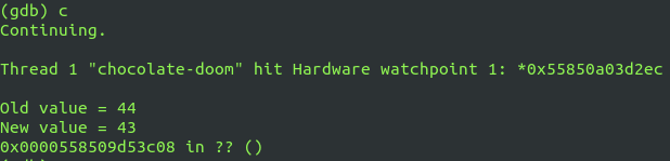 While not the primary target for our project, we also had a go at patching the chocolate-doom ELF binary. This was all done on an Ubuntu machine using similar tools as mentioned above, however, cheat engine was not available for Linux. Instead, to start finding interesting code paths in the ELF binary, we used a tool called scanmem which is similar to CheatEngine, but only gives the addresses of a value in memory and not which instruction alters it. After starting up scanmem and entering the changing ammo value a couple of times, it also isolated 3 possible addresses for ammo. These would change at each invocation of chocolate-doom because of the use of ASLR.