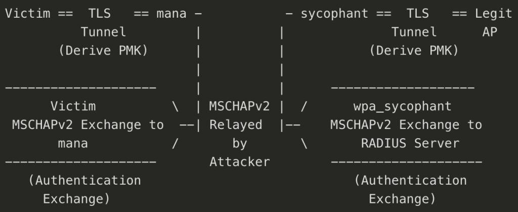 Sycophant and mana sync state and pass information between them using files. Once sycophant is started, it will wait for a victim to start authenticating against mana. After a victim has associated with mana and passed outer authentication (i.e the TLS part of PEAP) sycophant associates with the legit AP, negotiates outer authentication, then pulls information from mana and passes it verbatim to the AP for inner authentication. If it all works, this results in the legitimate RADIUS server returning a successful authentication and letting sycophant associate with the targeted legitimate access point.