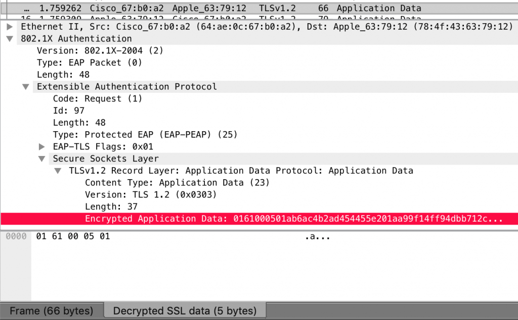 Earlier, when introducing PEAP, we said that by default (i.e,. if there’s no cryptobinding), the pairwise master key used for starting the WPA2 4-way handshake is taken from the outer TLS session. The authenticator sends this to the AP at this point, and the AP and Apple device happily complete the 4-way handshake and the device connects. Here’s an example: