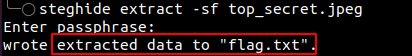 Using steghide and the passphrase from the previous clue (which was BbR4fZ6g) we could extract hidden data from the image. Having extracted the hidden file from the image revealed the flag.txt file.