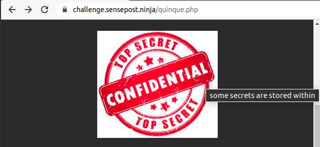 The clue contained in the secrets page suggested this was not the flag we were looking for but rather another clue. From here we needed to look for more clues on the quinque.php page. When inspecting the page we saw that the image title was some secrets are stored within.