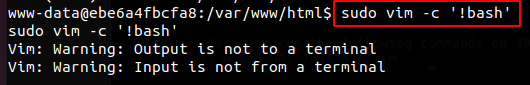 Having run sudo -l on the web server we saw that the www-data user was allowed to run vim as root. Vim is a text editor that gives one the ability to create and modify multiple forms of text. Vim can also run commands.