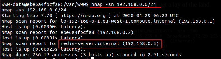 Using Nmap we found a Redis server on the internal network. Either redis-cli or telnet could have been used to connect to the database.