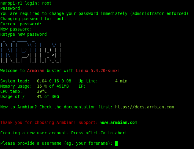 You should be able to connect to the serial port using your preferred terminal emulator (I like picocom, and I believe that Putty on Windows works quite well too). You shouldn’t have to worry about the baud rate, but 115200 should be fine. Using a Linux host, the serial port enumerates as a ttyACM device, e.g. /dev/ttyACM0. Once connected, you should be greeted by the initial Armbian login/setup screen. Log in as “root” with password “1234”, then reenter the password “1234” to start changing it to a new password. Remember your new root password! You probably don’t need to create an unprivileged user, but you can if you really want to!