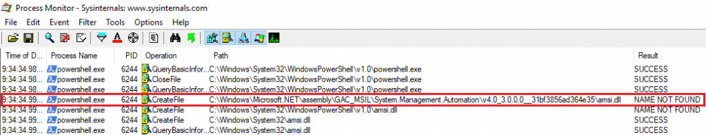 Before diving into the full details available in Cn33liz’s blog post on bypassing AMSI with DLL hijacking, I wanted to have a look at which API calls were made, registry keys opened/created, DLLs loaded and so on when running a PowerShell script. A review of ProcMon’s output revealed our first possible DLL hijack.